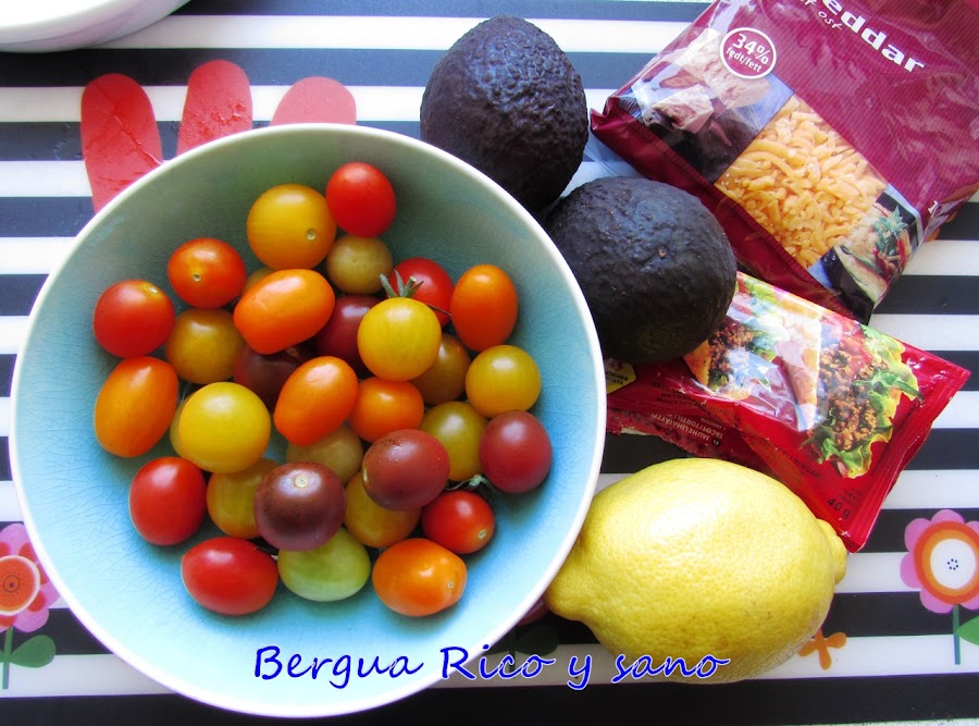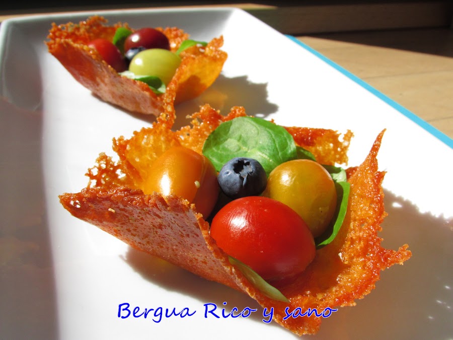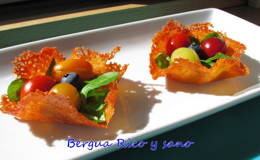 Esta versión puedes servirla como un cuquísimo entrante o cenártela tan ricamente. Primero hice unas cestitas que quedan crujientes como los nachos y con todo el sabor del queso cheddar; como elemento sorpresa rellené los tomatitos con guacamole, que no podía faltar; y en las cestitas serví una sencilla y deliciosa ensalada que incluye además canónigos y un toque dulce de arándano. Fresco, saludable y colorido pero, sobre todo, buenísimo el invento ;) No le hace falta ningún aliño. Para 8 cestitas: