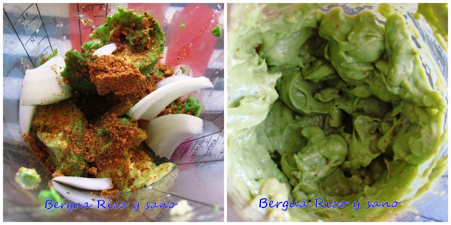 5. Ahora preparamos nuestro guacamole en un periquete. Sacamos la pulpa del aguacate con una cuchara, la echamos al vaso de la batidora, añadimos la cebolla pelada y las especias. Añadimos también limón al gusto y si queremos 1/2-1 diente de ajo. Batimos y probamos por si hubiera que añadir algo.