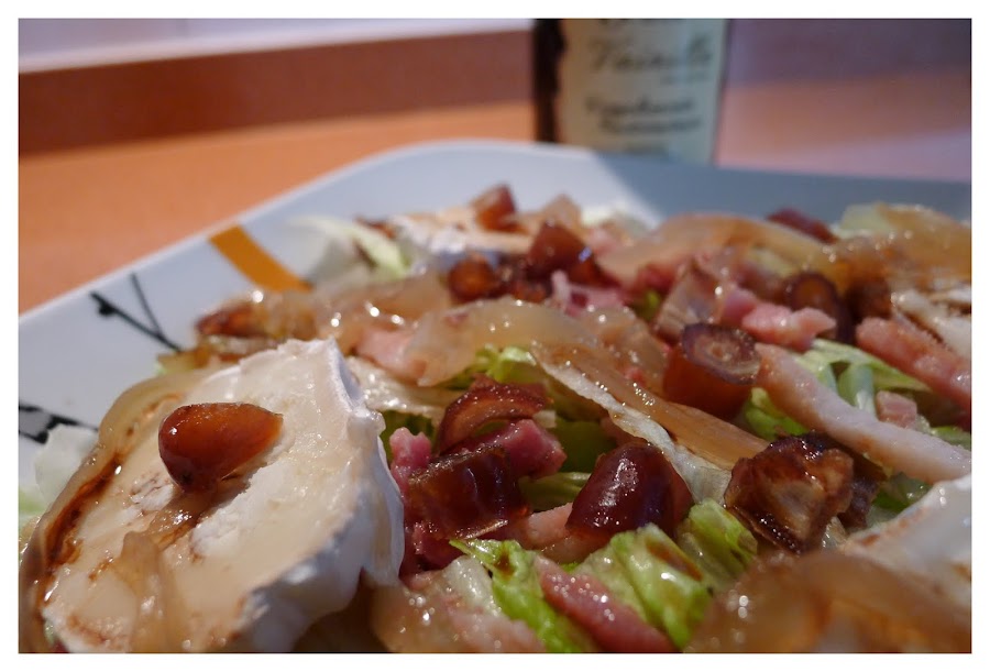 Ahora rehogaremos el bacon en un poco de aceite y cuando este hecho a nuestro gusto volcamos sobre la lechuga.Encima colocaremos tambien la cebolla confitada,los datiles (sin hueso) troceados menuditos y el queso de cabra (cantidades al gusto).
