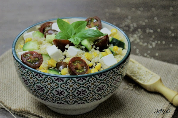 2. Escurrimos la quinoa y la colocamos en una ensaladera. Añadimos el pepino en dados, los tomatitos cortados por la mitad, el maíz escurrido y el queso.