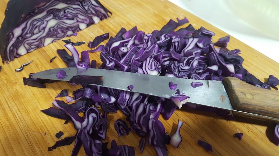 3.- Mientras troceamos la lechuga y la col y la lavamos y escurrimos bien en el centrifugador de lechuga.