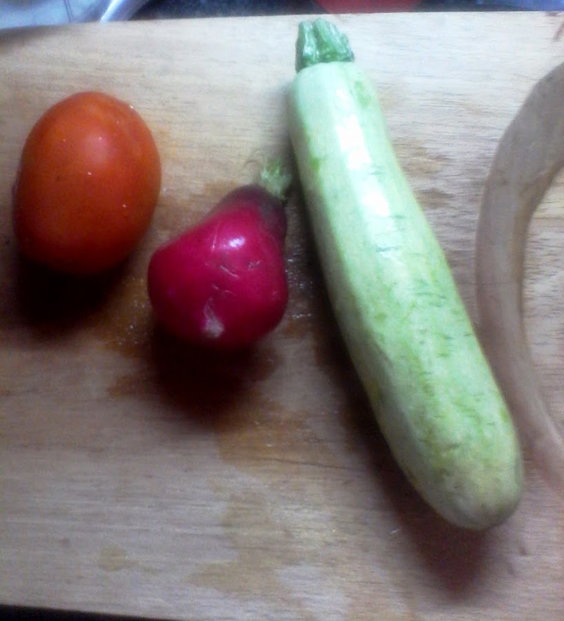 Pica el calabacín y el tomate en dados, más o menos del mismo tamaño, pela y ralla el rábano (más o menos grueso), pica el perejil de forma bien menuda, mezcla todo y condimenta con Sal, aceite y vinagre. y Listo ésta si es baja en calorías, muy fresca y sabrosa, atrévete a probarla. La foto no me ayuda mucho, pero créanme sabe mucho mejor de lo que se ve jeje. :)