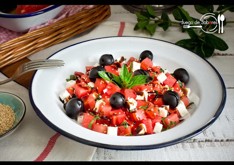 El otro día me propusieron ir de picnic. Hacía años que no me hacían una proposición así. Los más jóvenes ni tan siquiera sabrán de qué va la cosa. Un picnic es una comida campestre a base de ensaladas, tortillas, bocadillos y frutas. Acordamos que cada familia llevaría un plato. Puse la casa patas arriba para encontrar la típica cesta de mimbre, ese añorado objeto imprescindible para cualquier picnic que se precie. Todo muy british, un pelín cursi, muy de película. Cuando encontré la cesta se me planteó el problema de cómo llenarla, qué hacer de primer plato pues era lo que habíamos acordado con el resto. Pensé en una ensalada distinta, sencilla, económica, fresca, vistosa y se me ocurrió ésta a base de sandía, queso feta, hierbabuena y aceituna negras. Les gustó y además el día fue espléndido.