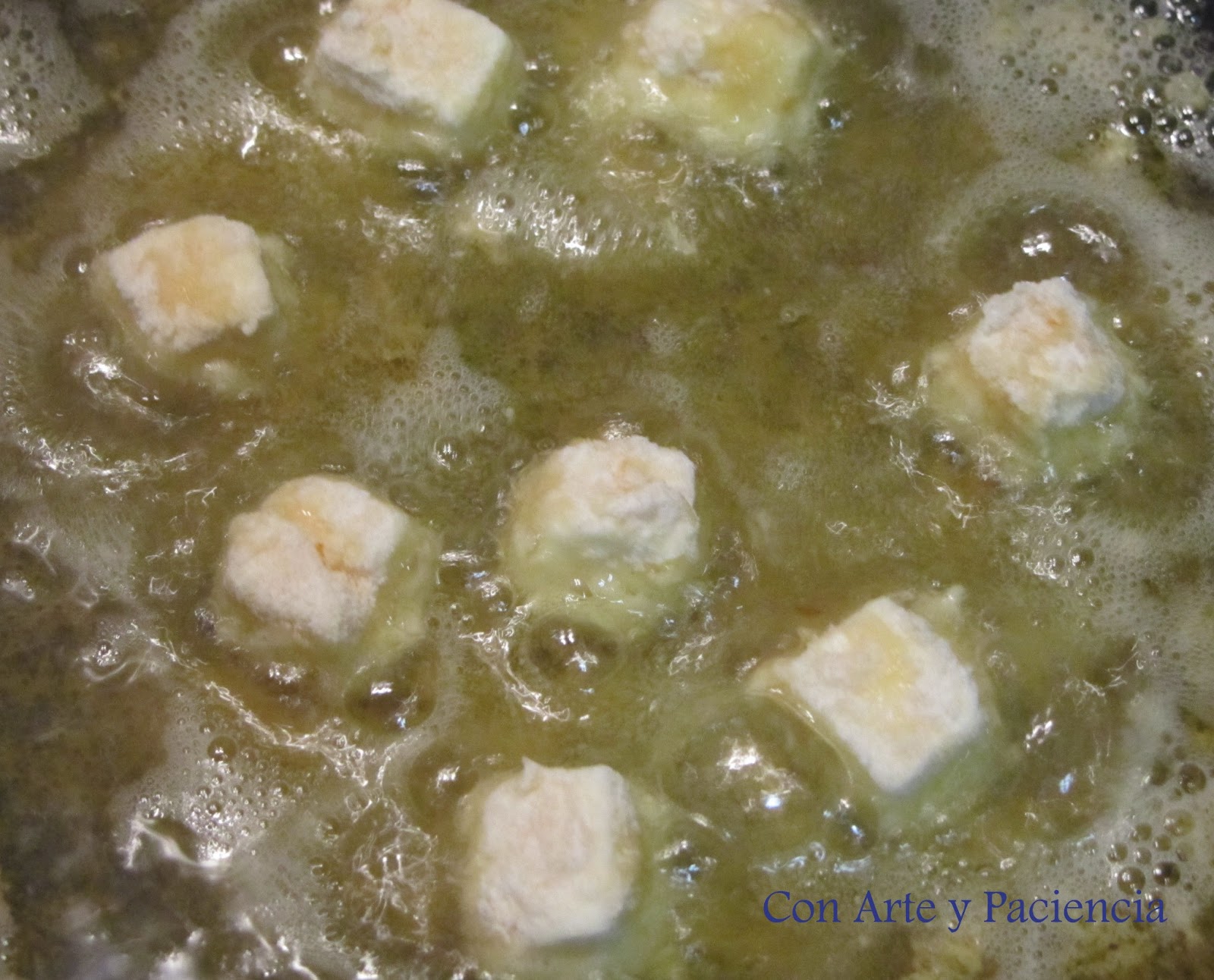Pasamos por huevo y harina los dados de feta y los freímos en una sartén con aceite de oliva no más de un minuto a fuego medio. Retiramos y los dejamos sobre papel de cocina para retirar el exceso de aceite.