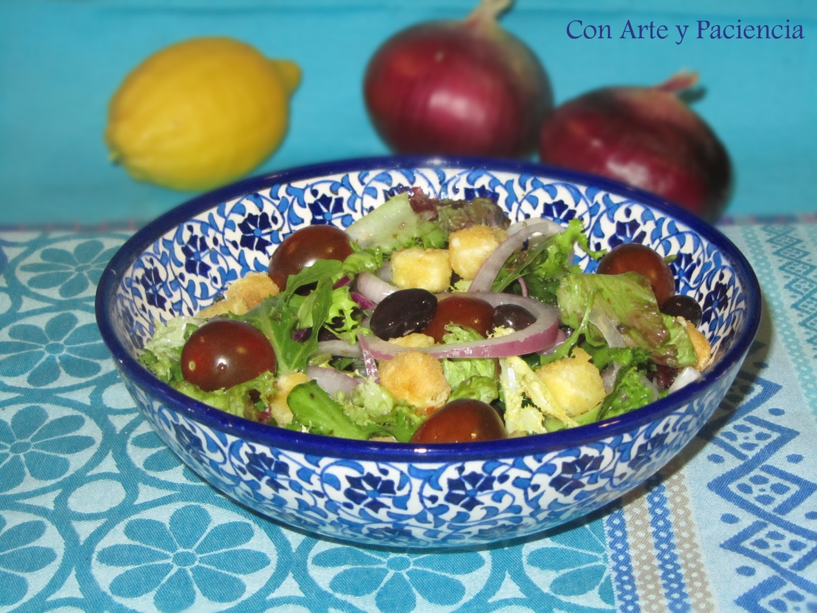 Sobre la lechuga añadimos los tomates, cebolla cortada, aceitunas, aliño y removemos. Agregamos el queso rebozado y listo para degustar esta ensalada como entrante o cena. Si no disponéis de aceitunas griegas, las aragonesas son otra opción muy buena.