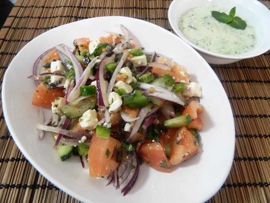 En un bol iremos colocando los siguientes ingredientes, el tomate cortado en trozos de bocado, la cebolla en juliana, la mitad del pepino en medias rodajas, el pimiento en trocitos mas pequeños, las olivas y la menta picadas, el queso roto con la mano, un chorrito de aceite de oliva, sal y pimienta, y movemos todo bien, para que se quede bien mezclado.