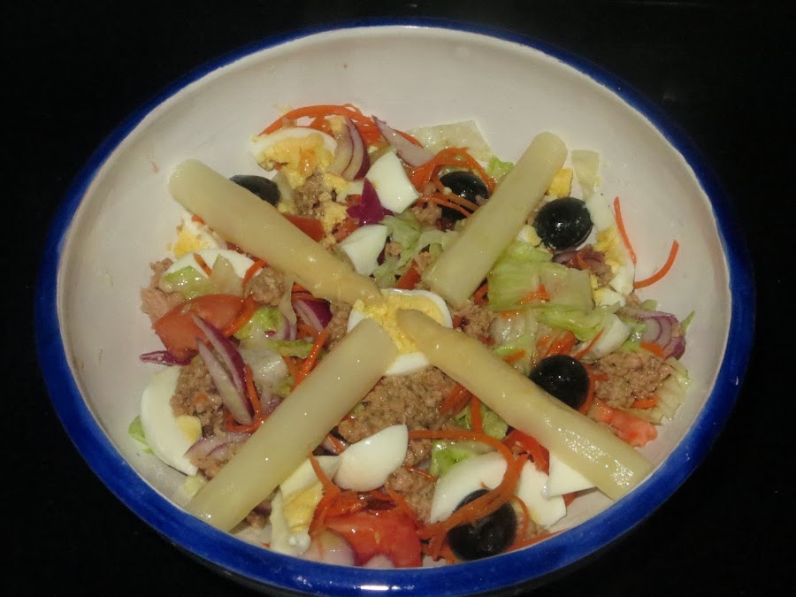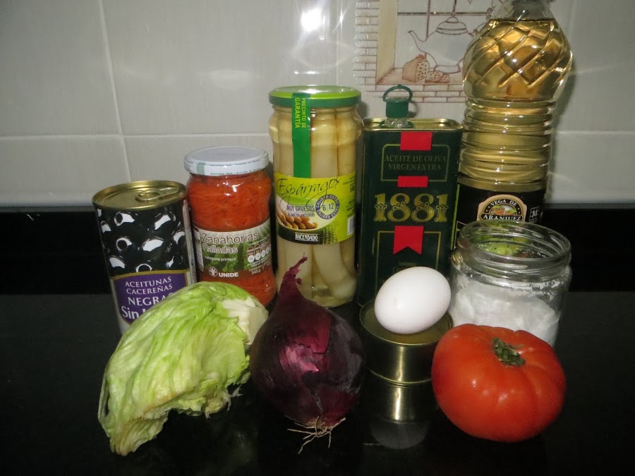 Lo primero que hacéis es lavar bien la lechuga, la secáis y la cortáis en trozos pequeños, lo mismo hacéis con el tomate. Esto será la base de nuestra ensalada, ahora añadís la zanahoria rallada, las aceitunas, la cebolla cortada en juliana, la lata de atún bien escurrida y el huevo duro picado y por último colocáis los espárragos para decorar. Saláis y le echáis aceite y vinagre al gusto y ya está lista para servir.