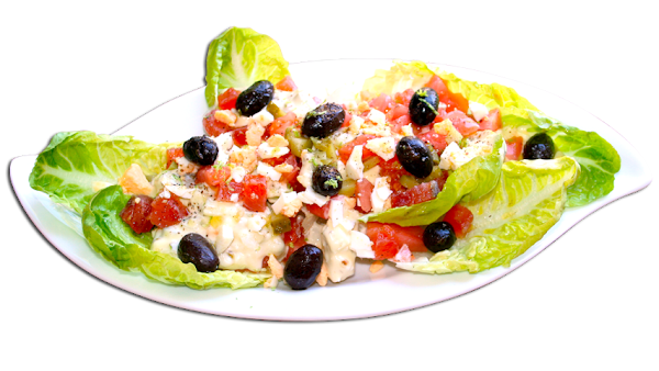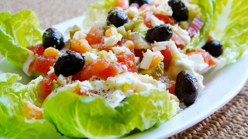 Más de una vez nos vemos en la perezosa necesidad de apañarnos con lo que tenemos en la nevera para evitar tener que salir a comprar aquello que falta. Esta ensalada es un ejemplo aunque el resultado ha sido magnífico: una rápida, rica y refrescante ensalada para comer a bocados utilizando las propias hojas de la lechuga a modo de cubiertos.