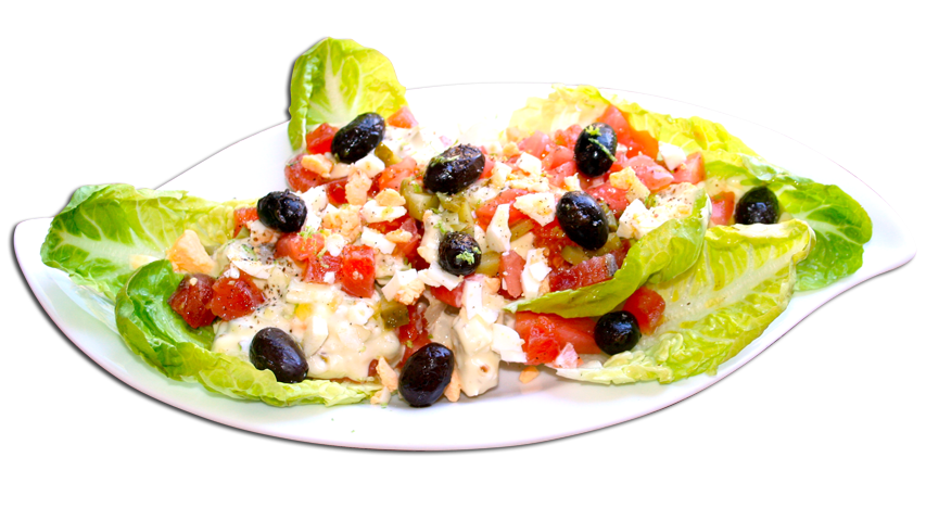Por último coloqué en la fuente unas hojas de un cogollo de lechuga, puse sobre ellos un tomate troceado en cubitos y sin piel, la tártara, el salmón y un poco más de tomate, de pepinillo picado y de huevo duro, unas aceitunas negras para dar un poco de color y listo, a disfrutar.