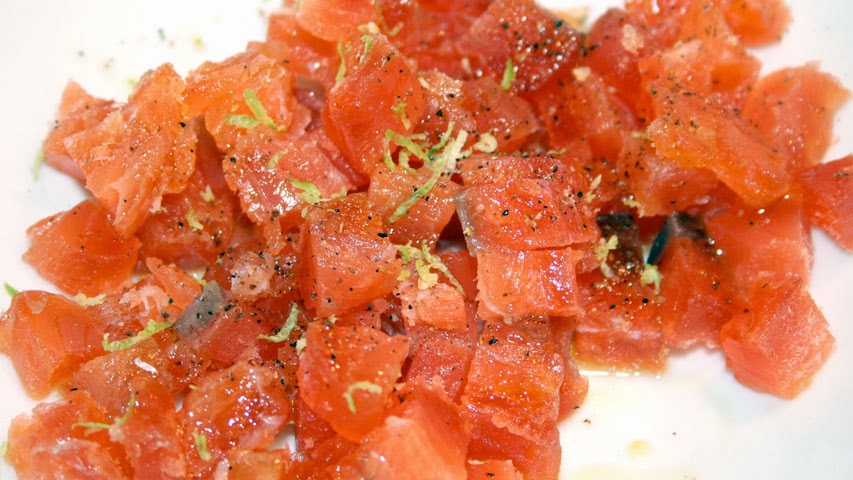 Aliñé el salmón tras trocearlo con aceite de oliva, ralladura de limón, vinagre de Jerez y un poco de sal y pimienta.