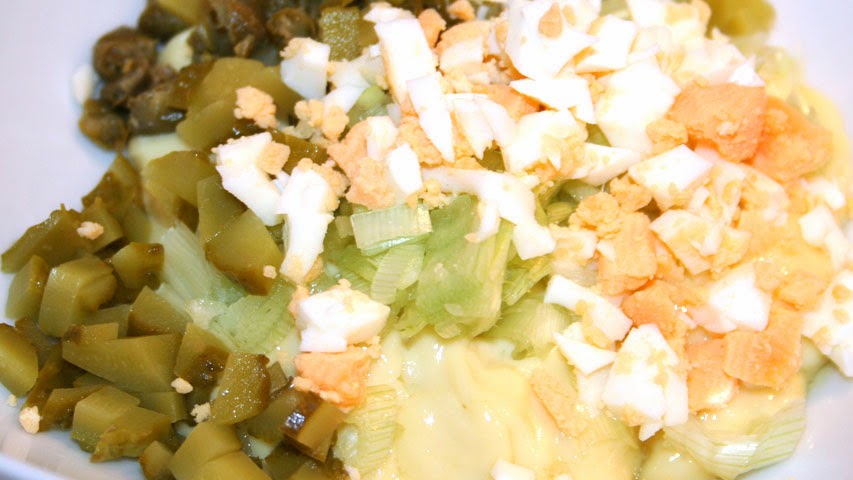Preparé una especie de salsa tártara con mahonesa que sobró de la ensaladilla del día anterior, pepinillos, alcaparras, cebolleta, huevo duro, un poco de vinagre de Jerez y aceite de oliva.