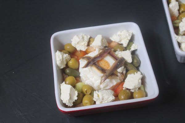 La comida consiste en una ensalada individual, muy variada, basada en dos lácteos, un yogurt griego y unas lonchas de queso fresco salado, pero además tiene huevo duro, anchoas, aceitunas, tomate, pepino
