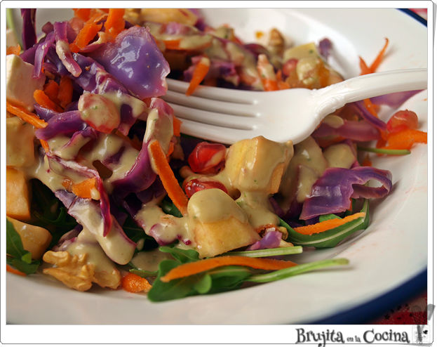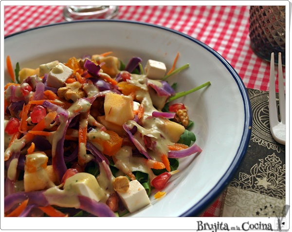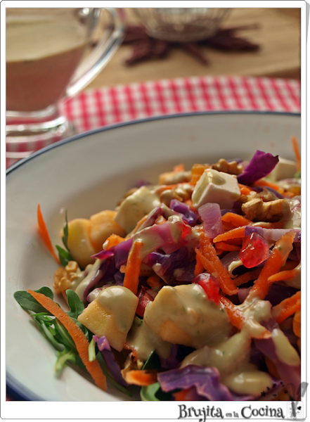 Hoy como homenaje y recuerdo a aquella lombarda navideña voy a darle una vuelta y hacerla en ensalada, porque las ensaladas molan mucha y ahora hemos cogido como costumbre en Navidad empezar con una ensalada, ya os enseñé este año la de cous cous la propuesta de hoy es vegetariana y es una forma estupenda de comer verdura de una forma colorida y rica. Animaos.