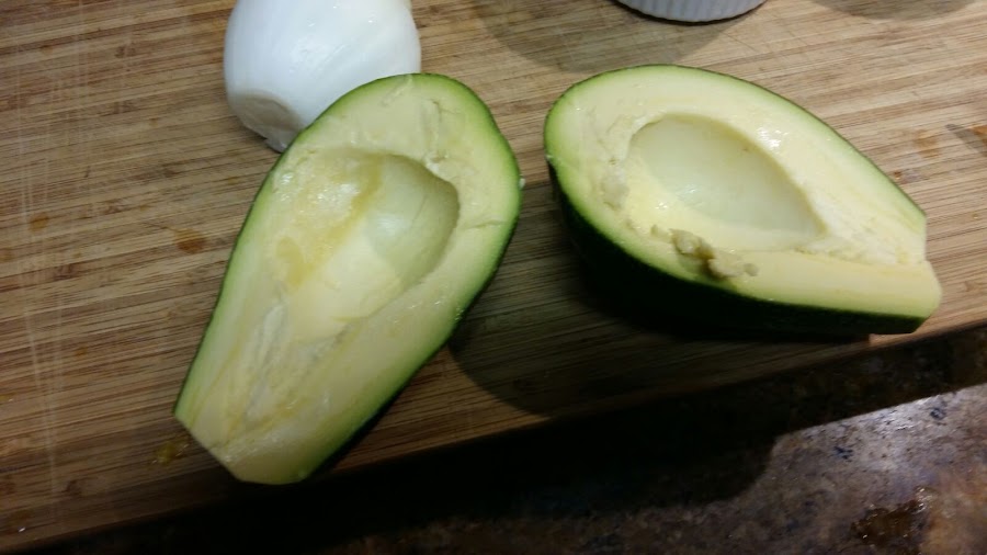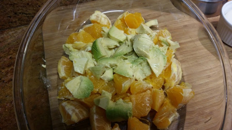 Con una cuchara vamos sacando la pulpa del aguacate de la piel y la echamos por encima de las naranjas.
