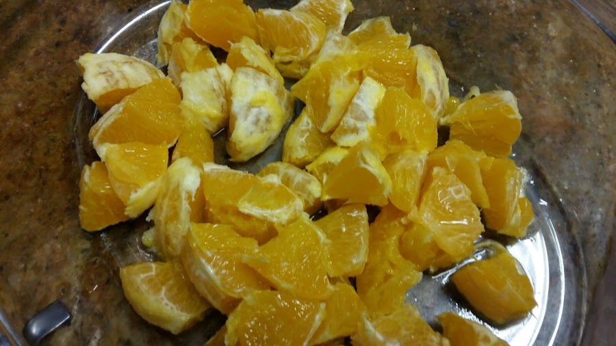 Empezamos pelando las naranjas, cortándolas a gajos y cada gajo en dos.