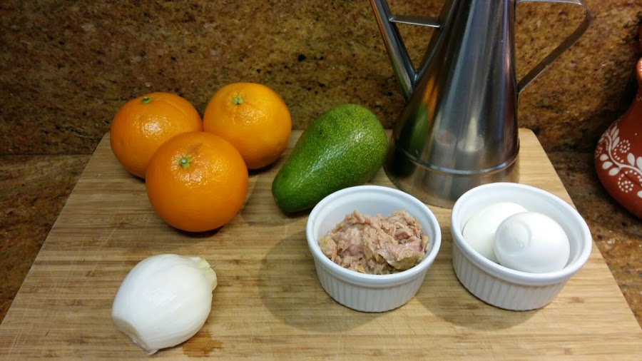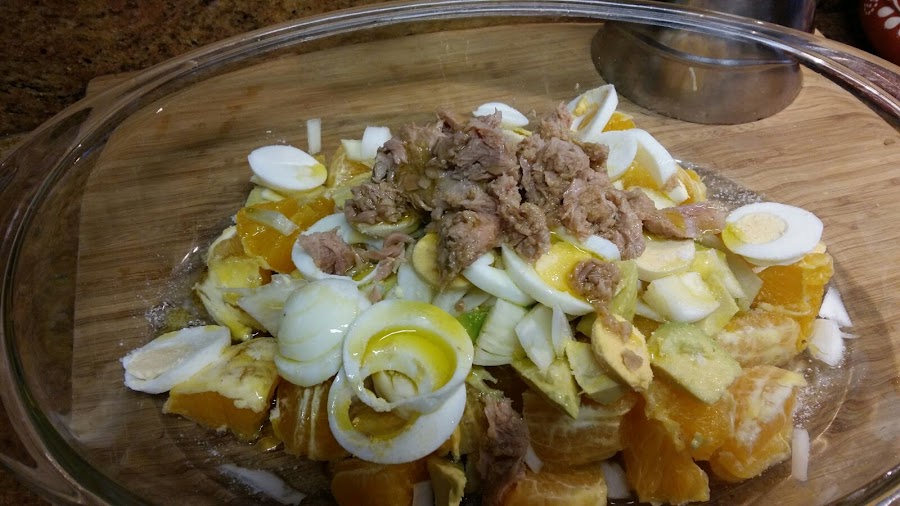 El último paso es, cortar la cebolleta en trocitos y los huevos en rodajas, echarlo por encima de la naranja y aguacate, añadir el atún y sazonar con un buen puñadito de sal y un buen chorreón de aceite.