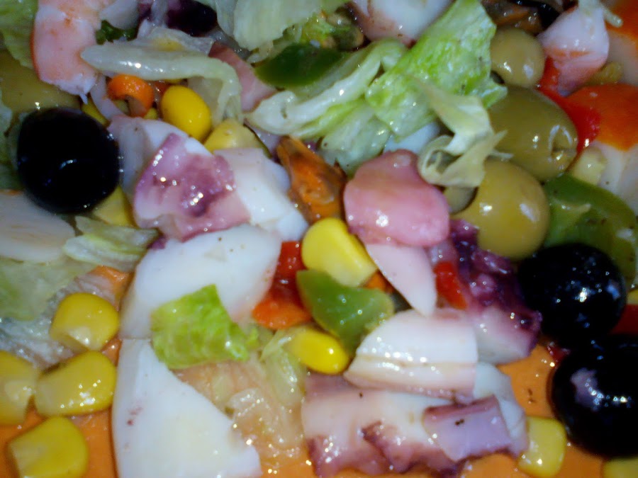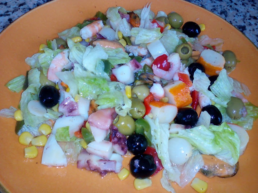 Ingredientes para None comensales Gambas,Pulpo,Palitos de Cangrejo,Cebolla,Cbeolletas,Pimiento Verde,Pimiento Rojo,Aceite,Vinagre,Sal,Mejillones al vapor,Huevo duro (opcional) Abrimos los mejillones al vapor y reservamos unos cuantos para adornar. Cortamos en trozos pequeños el resto de los ingredientes, los mezclamos y aliñamos con una vinagreta. Si queréis, podéis añadir huevo duro.