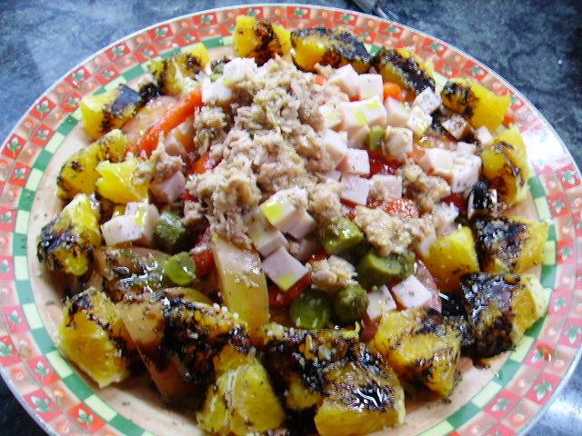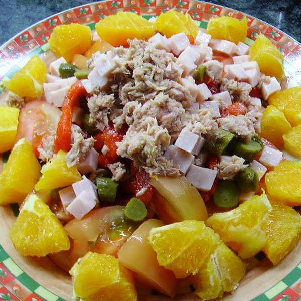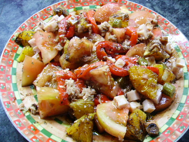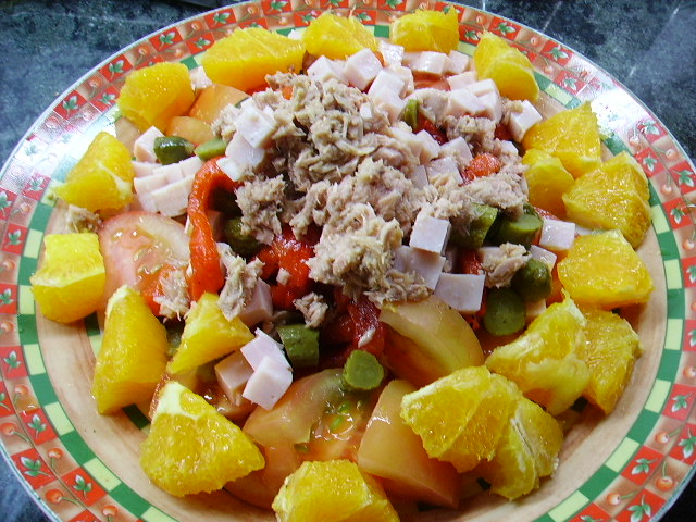 2.- Rodeamos el tomate con la naranja bien pelada y troceada.