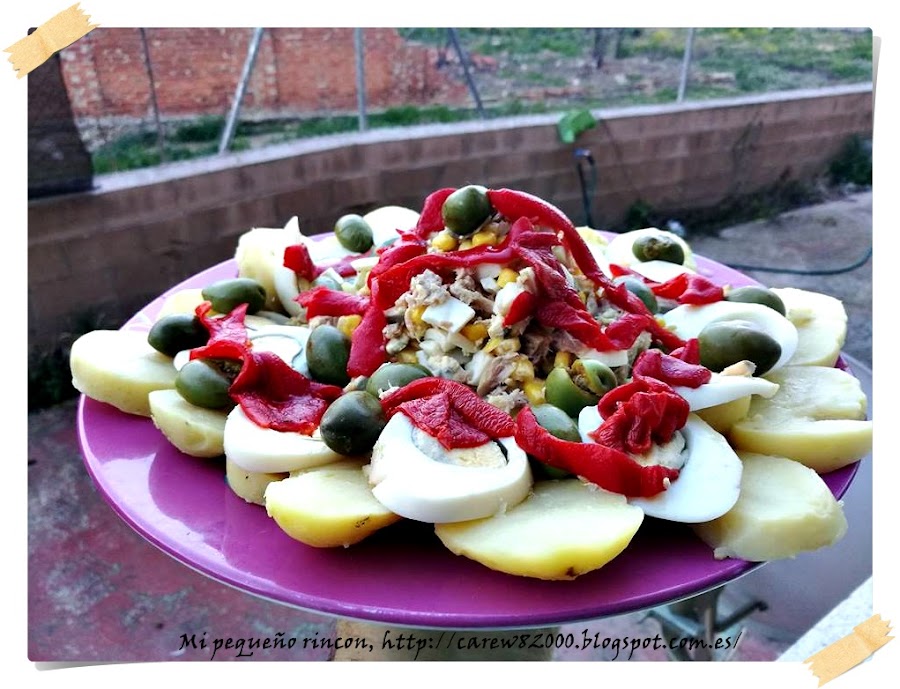 Preparamos una ensaladera no muy honda y vamos colocando las rodajas de patata en el fondo, ahora encima nuestra mezcla de huevo, atún, cebolla y maíz y acabaremos colocando tiras del pimiento asado y lo terminamos con las aceitunas.