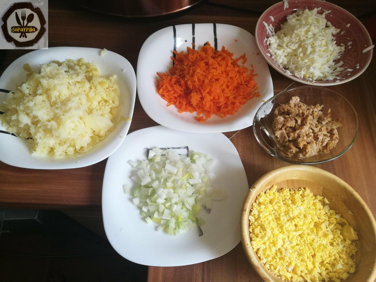 Las capas las montaremos en este orden: atún en la base, cubrir con una capa fina de mayonesa. Ahora las claras picadas y capita de mayonesa. Sobre ésta la zanahoria y capita de mayonesa. Ahora las patatas, mezcladas con la cebolleta picada, otra fina capa de mayonesa.