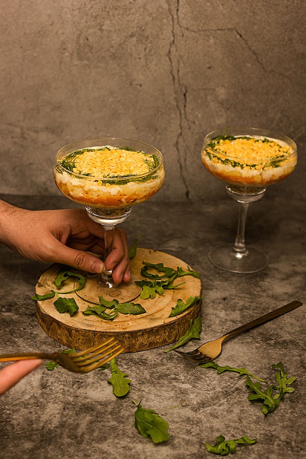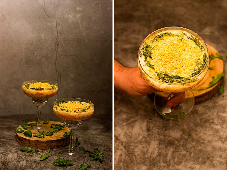 La ensalada mimosa debe su nombre a la conocida flor de primavera y es un plato festivo que aunque está presente durante todo el invierno y primavera, es especialmente tradicional en Año Nuevo, además se ha convertido en todo un clásico de la gastronomía rusa y suele estar presente en todas las cartas de los restaurantes.