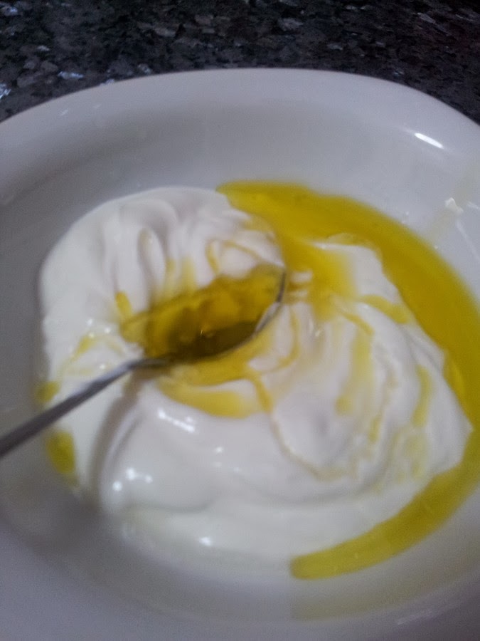 Vaciamos el yogurt si esta bien frió mejor, en un bol, le añadimos, la cucharada de aceite de oliva virgen y la del vinagre, batimos bien hasta que emulsione.