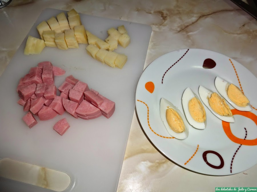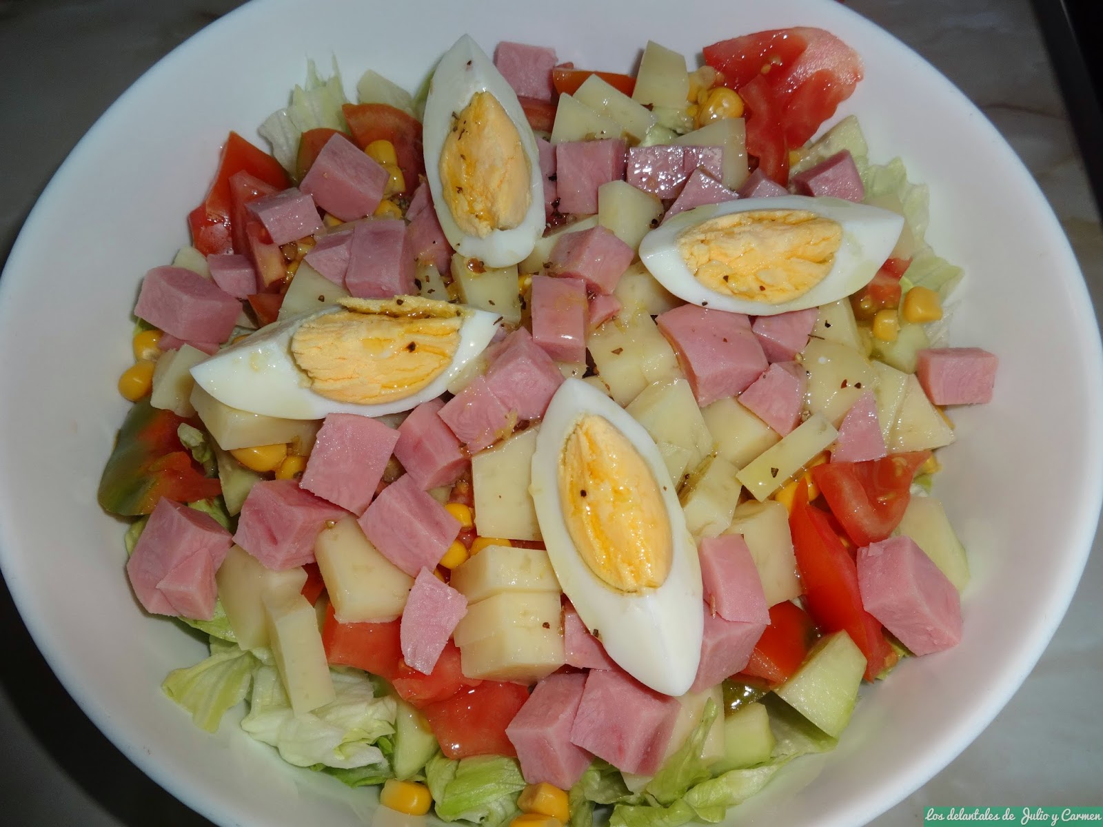 Partimos el jamón york (si lo teníamos en una barra), al igual que el queso. Lo echamos en la ensaladera junto con el maíz.