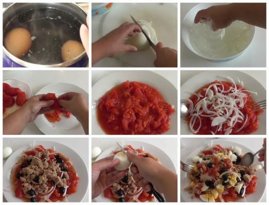 Seguido le añadimos las aceitunas, el atún escurrido y un poco desmigado, y por último os huevos ya cocidos que partiremos a groso modo.