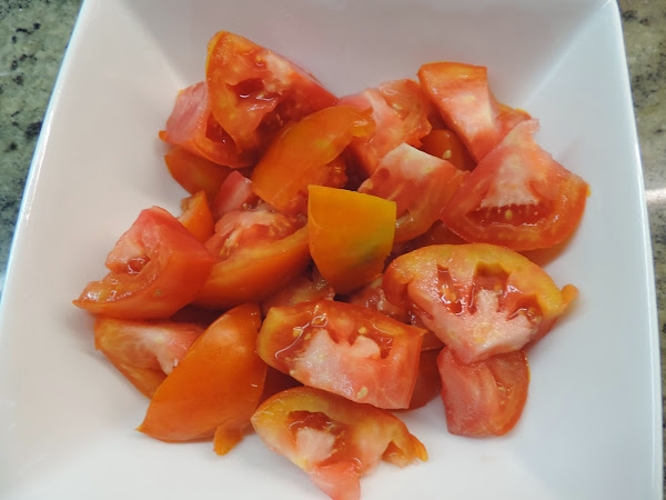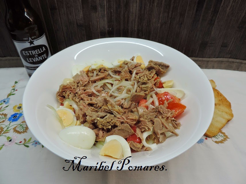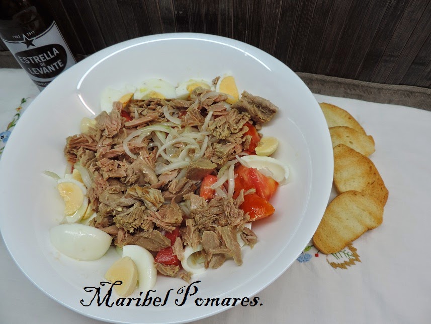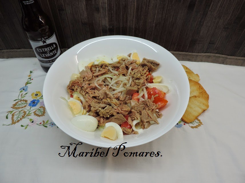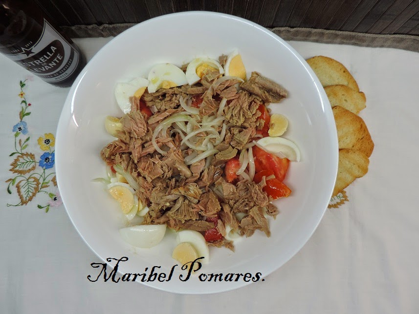 Y los echamos con el tomate, la cebolla escurrida del vinagre y sal, con el atún.
