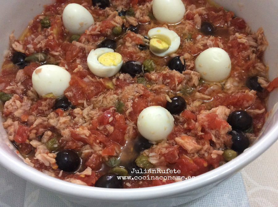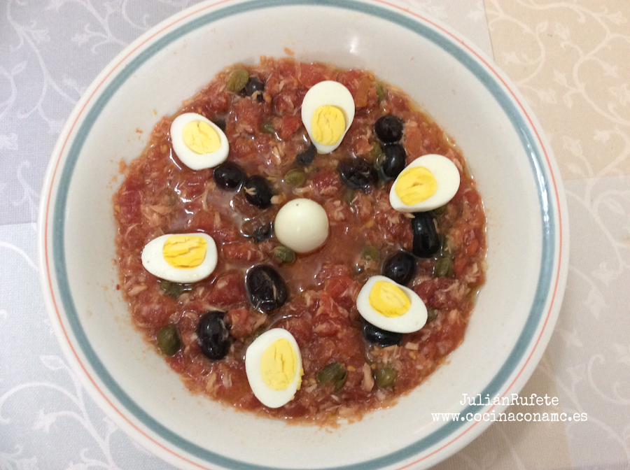 La llamada ensalada murciana era la ensalada por excelencia del invierno donde por carecer de tomates durante los rigores de esta estación solo se tenían a disposición los tomates elaborados por ellos mismos mediante tomate en conserva casera, producto que los huertanos y gente del mundo rural venían elaborando en todos los lugares de la región. En casa la preparamos durante todo el año, alternando con otras ensaladas, sobre todo desde que contamos con cebolla tierna durante todas las estaciones. Se trata de plato rico y equilibrado, ya que contamos con los beneficios del tomate, cebolla, tápena o alcaparra y otros elementos como el atún, el huevo y nuestro oro líquido, el aceite de oliva virgen extra. Todos elementos de la zona.