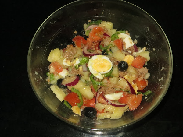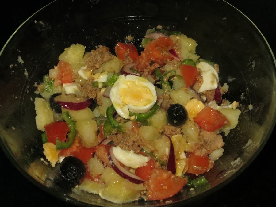 Luego añadimos el pimiento, la cebolla, los tomates y la lata de atún escurrido. Salamos, hacemos una vinagreta con aceite y vinagre y se lo echamos por encima y ya está lista para servir. También se puede dejar enfriar en la nevera y sacarla cuando lleguen nuestros invitados.