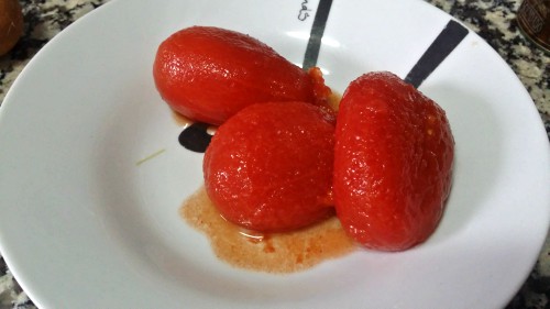 - Abrir el bote de conserva de tomate y escurrirlo en un colador para que pierdan el agua, sin aplastarlos.