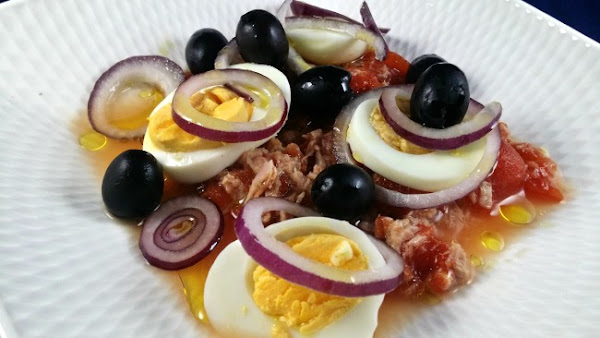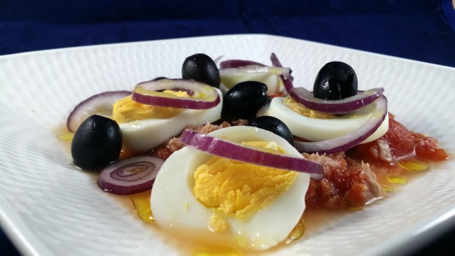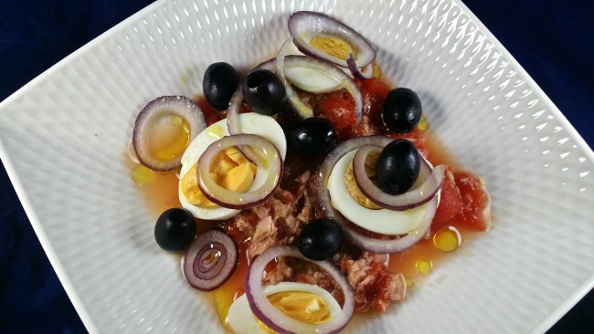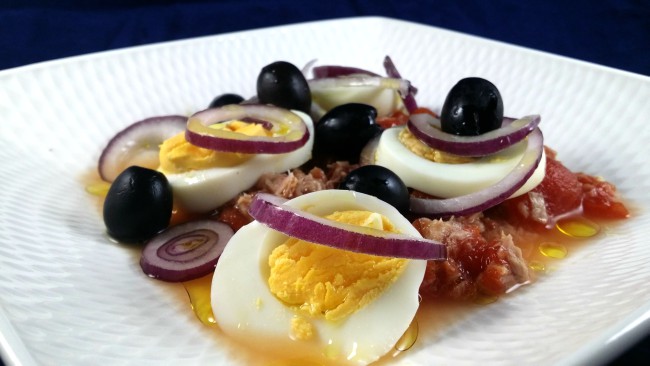 Siempre había un buen plato de esta ensalada en la cafetería de la facultad. Es una receta muy típica de aquella tierra. Lo peor de esta ensalada es que te comes media barra de pan mojando el caldito con el aceite… (por eso también se le llama moje o mojete murciano) y eso no puede ser. No es bueno para los michelines, o al revés, es muy bueno para los michelines, ¡para alimentarlos!