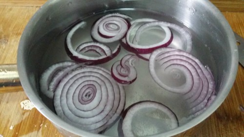 - Cortar la cebolleta en juliana y disponer en un bol con agua fría y sal. Dejar reposar unos minutos. Así picará mucho menos.