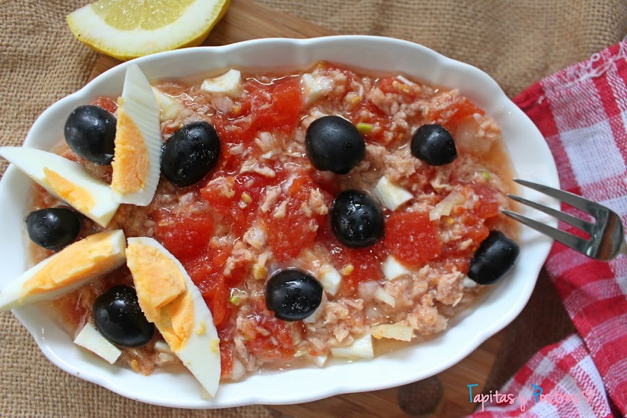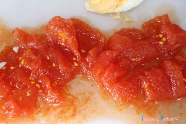 Y añadimos también el tomate y aliñamos. Adornamos con gajos de huevo cocido ¡Lista!