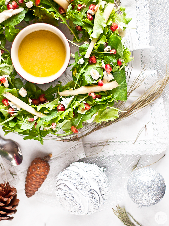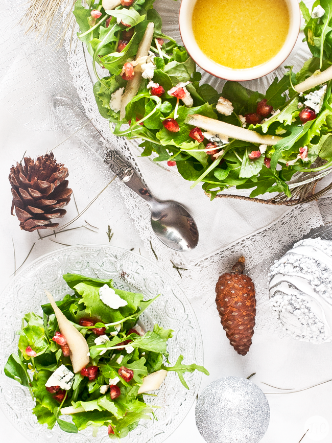 Ensalada Navideña de pera, gorgonzola y granada con vinagreta de mostaza y miel