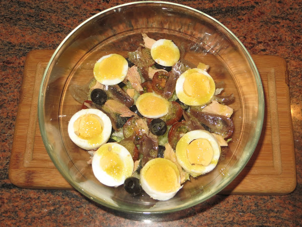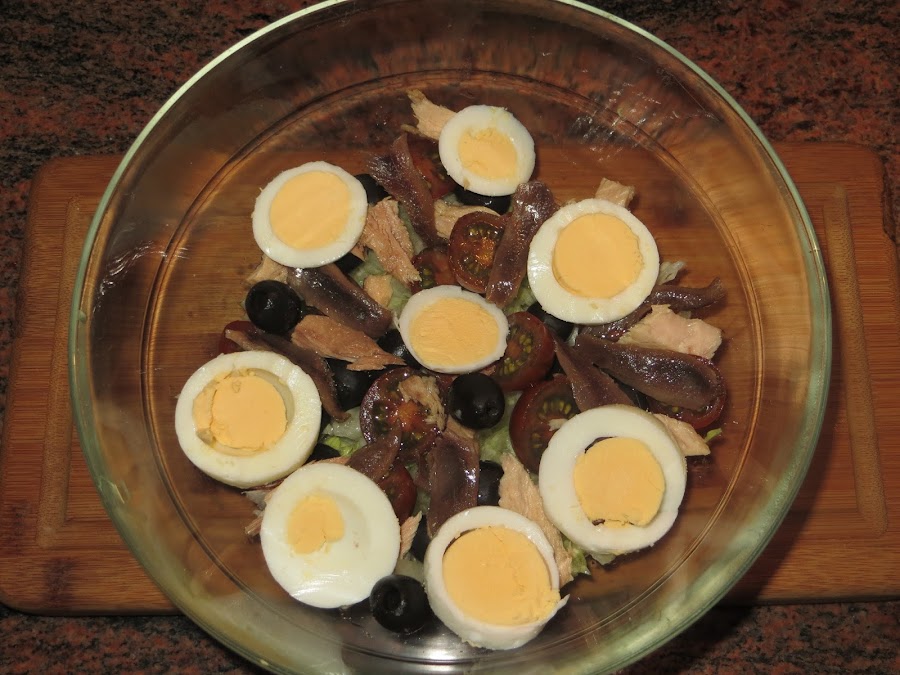 Mientras tanto vamos preparando nuestra ensalada, cortamos la lechuga, los tomates, las anchos, desmenuzamos el atún, echamos las aceitunas negras y cuando los huevos estén listos dejamos enfriar, pelamos, cortamos y los añadimos.