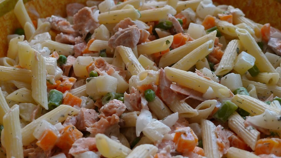 Añadir a la salsa elaborada, los ingredientes de la ensalada: Pasta, Verduras y Salmón que habíamos reservado. Mezclar todo con movimientos suaves.