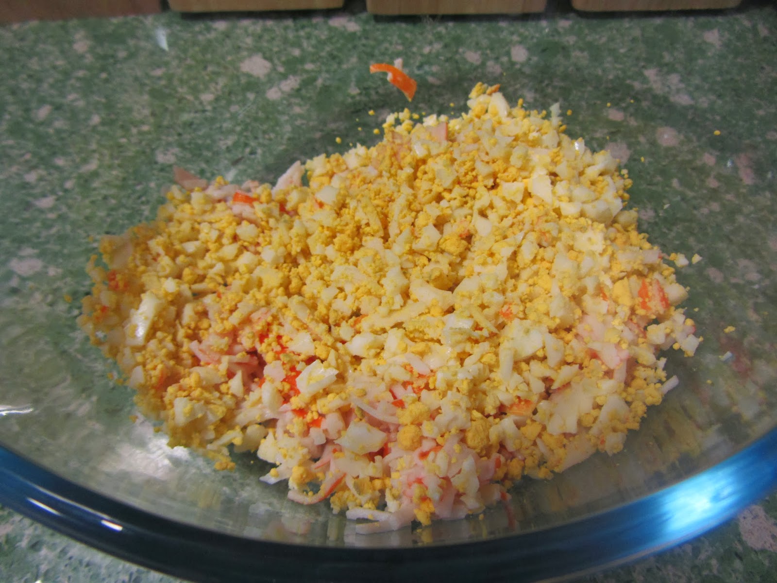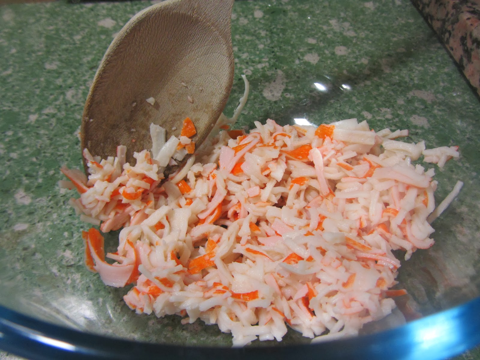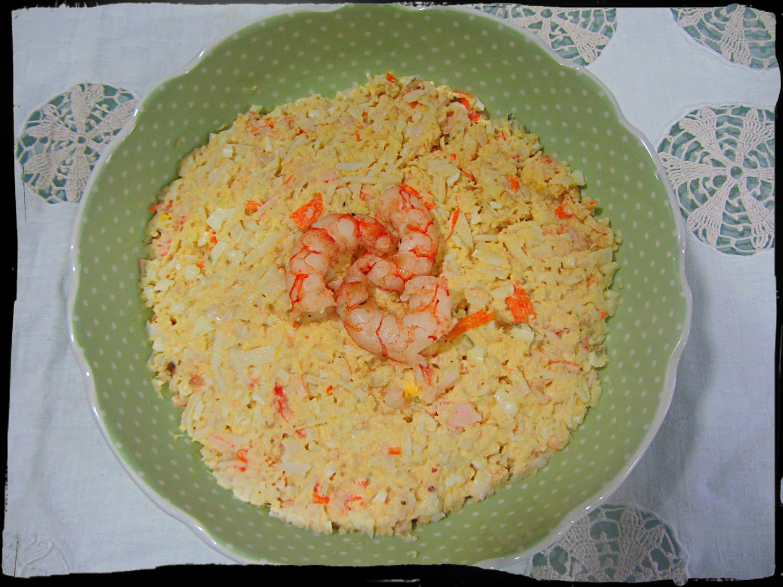 Cocemos los huevos, y los reservamos (yo los paso por agua fría para cortar la cocción, doy un pequeño golpecito en la cáscara, los giro entre las manos para ir rompiéndola, y los pelo inmediatamente, porque me resulta más fácil pelarlos así que cuando están fríos) Cocemos el rape. Yo lo hago en el microondas: lo pongo en una fuente con tapa apta para el micro, lo espolvoreo con ajo molido, y programo 3 minutos a 800 w. Puede necesitar un pelín más de tiempo, pero muy poco. En cualquier caso, cualquiera que sea el método que utilicemos (al vapor, cocción tradicional en agua, microondas...) lo importante es NO PASARSE DE COCCIÓN, porque un rape cocido "de más" se convierte en un trozo de estropajo. Salteamos las gambas en una sartén con poco aceite, una guindilla y ajo molido. Las cocinaremos durante unos 2 min, hasta que tomen color (tampoco conviene hacerlas demasiado). Retiramos la guindilla (dato importante a tener en cuenta: una vez se me olvidó, y después es una "gracia" encontrársela en la ensalada, jajaja), y apartamos algunas gambas para adornar la ensalada. Ahora vamos a ir picando los ingredientes. Os pondré cómo lo hago con la Thermomix; pero, evidentemente, lo podemos hacer a mano o con una picadora cualquiera. Lo importante es que quede todo bien picadito, pero no triturado, que "se noten" los trocitos. Picamos primero los palitos de cangrejo, programando en la Thermomix 4-5 segundos, velocidad 4 con giro a la izquierda (así quedan en hilitos). Sacamos, y reservamos. Sin lavar el vaso, ponemos los 2 huevos duros, y programamos 4 segundos a velocidad 4. Sacamos, y reservamos en el mismo bol o ensaladera donde hemos colocado los palitos. En todos los casos, siempre iremos comprobando que no queda algún trocito sin picar. Sin lavar el vaso, picamos el rape (durante 3 segundos a velocidad 4), y lo agregamos al bol. Seguimos sin lavar el vaso (jajaja, parecemos unos guarros, pero no es así), y ponemos las gambas. Programamos 4 segundos a velocidad 4, y las añadimos al bol. Salpimentamos, y mezclamos todo bien. Probamos el punto de sal. Agregamos un chorrito de leche Ideal (esto hará que la ensalada quede más suave y jugosa), y removemos bien. Y ahora, agregamos la mayonesa. Os recomiendo que no añadáis más de 4 cucharadas, porque, de lo contrario, resultaría muy pesada. Removemos muy bien, decoramos con las gambas que habíamos reservado (y, si queremos, con algún tomatito cherry o tiras de pimientos rojos asados), y refrigeramos durante unas horas. Puede hacerse de un día para otro. Espero que os guste, y que tengáis una buena entrada de semana.