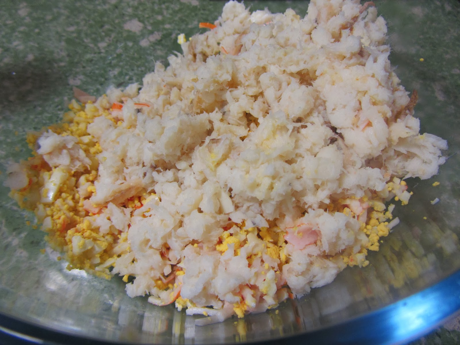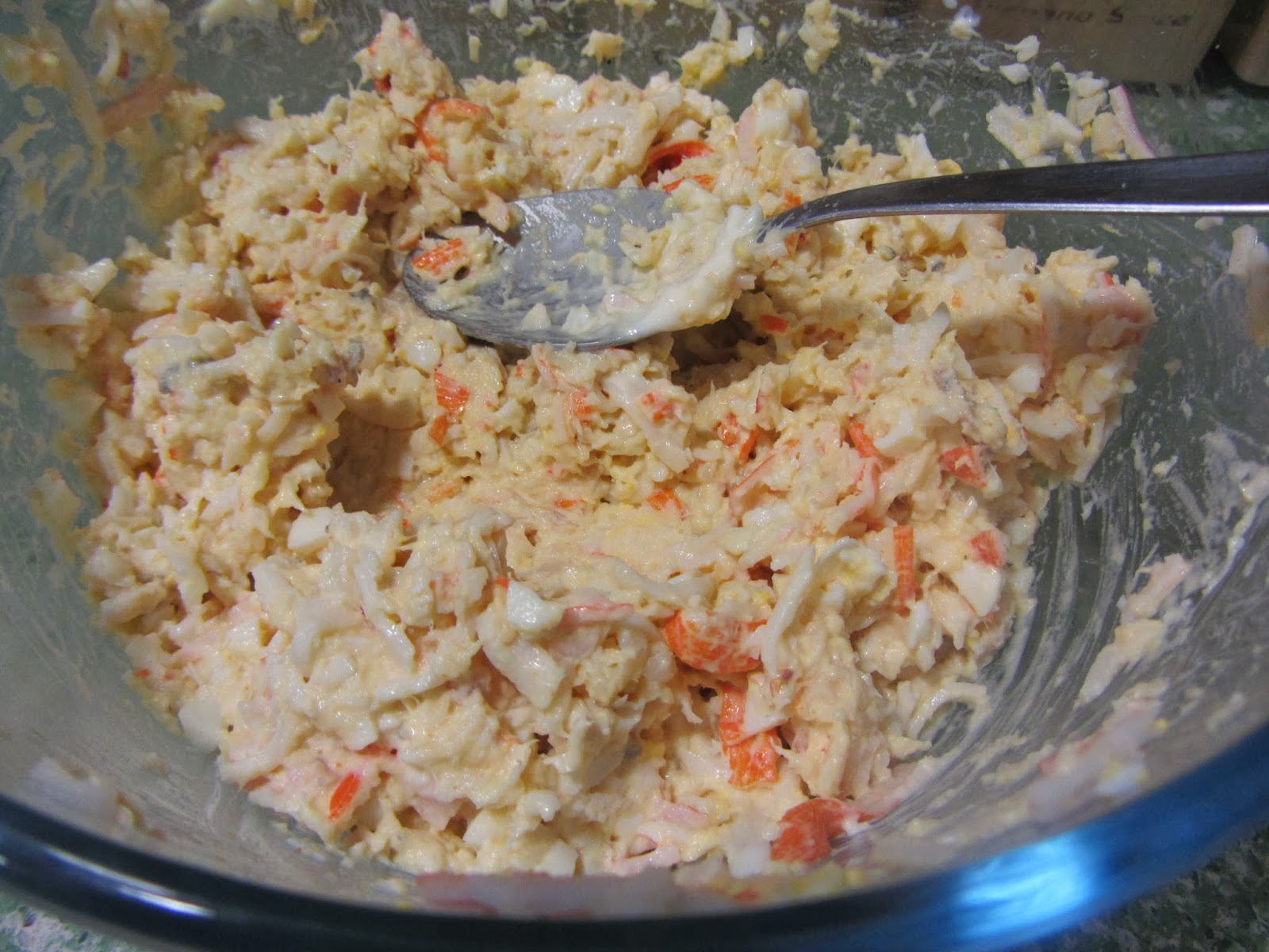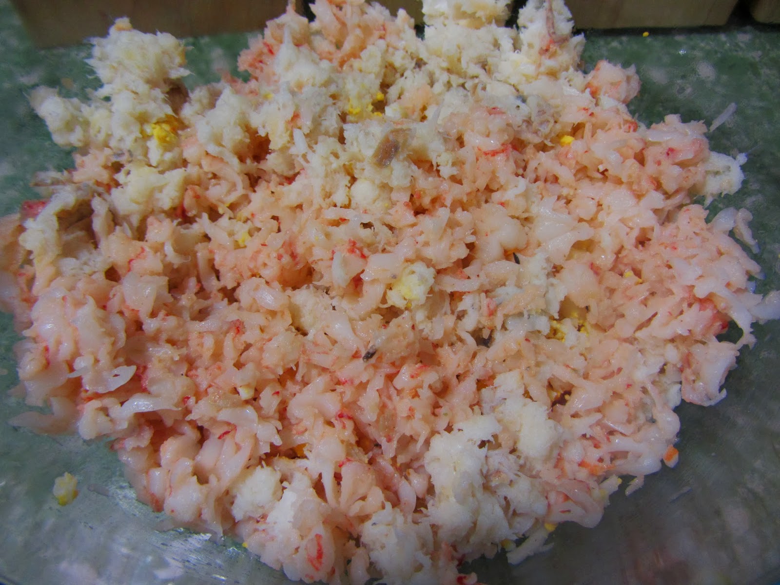 Cocemos los huevos, y los reservamos (yo los paso por agua fría para cortar la cocción, doy un pequeño golpecito en la cáscara, los giro entre las manos para ir rompiéndola, y los pelo inmediatamente, porque me resulta más fácil pelarlos así que cuando están fríos) Cocemos el rape. Yo lo hago en el microondas: lo pongo en una fuente con tapa apta para el micro, lo espolvoreo con ajo molido, y programo 3 minutos a 800 w. Puede necesitar un pelín más de tiempo, pero muy poco. En cualquier caso, cualquiera que sea el método que utilicemos (al vapor, cocción tradicional en agua, microondas...) lo importante es NO PASARSE DE COCCIÓN, porque un rape cocido "de más" se convierte en un trozo de estropajo. Salteamos las gambas en una sartén con poco aceite, una guindilla y ajo molido. Las cocinaremos durante unos 2 min, hasta que tomen color (tampoco conviene hacerlas demasiado). Retiramos la guindilla (dato importante a tener en cuenta: una vez se me olvidó, y después es una "gracia" encontrársela en la ensalada, jajaja), y apartamos algunas gambas para adornar la ensalada. Ahora vamos a ir picando los ingredientes. Os pondré cómo lo hago con la Thermomix; pero, evidentemente, lo podemos hacer a mano o con una picadora cualquiera. Lo importante es que quede todo bien picadito, pero no triturado, que "se noten" los trocitos. Picamos primero los palitos de cangrejo, programando en la Thermomix 4-5 segundos, velocidad 4 con giro a la izquierda (así quedan en hilitos). Sacamos, y reservamos. Sin lavar el vaso, ponemos los 2 huevos duros, y programamos 4 segundos a velocidad 4. Sacamos, y reservamos en el mismo bol o ensaladera donde hemos colocado los palitos. En todos los casos, siempre iremos comprobando que no queda algún trocito sin picar. Sin lavar el vaso, picamos el rape (durante 3 segundos a velocidad 4), y lo agregamos al bol. Seguimos sin lavar el vaso (jajaja, parecemos unos guarros, pero no es así), y ponemos las gambas. Programamos 4 segundos a velocidad 4, y las añadimos al bol. Salpimentamos, y mezclamos todo bien. Probamos el punto de sal. Agregamos un chorrito de leche Ideal (esto hará que la ensalada quede más suave y jugosa), y removemos bien. Y ahora, agregamos la mayonesa. Os recomiendo que no añadáis más de 4 cucharadas, porque, de lo contrario, resultaría muy pesada. Removemos muy bien, decoramos con las gambas que habíamos reservado (y, si queremos, con algún tomatito cherry o tiras de pimientos rojos asados), y refrigeramos durante unas horas. Puede hacerse de un día para otro. Espero que os guste, y que tengáis una buena entrada de semana.