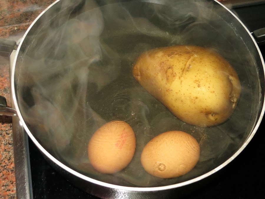 Lo primero que hacemos es cocer las patatas y los huevos, las patatas tardarán de 25 a 35 minutos, dependiendo del tamaño, mientras que los huevos solo tardarán 10 minutos.