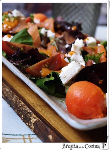 Disponemos en el plato las lechugas que hemos elegido como base, en mi caso brotes tiernos, despu´s con un sacabolas hacemos bolitas de papaya (si no se tiene se puede hacer con una cuchara o cortar en dados), las distribuimos, cortamos tiras de salmón que colocamos y el queso de cabra desmigado por encima. Cortamos los tomates en medio o cuartos.