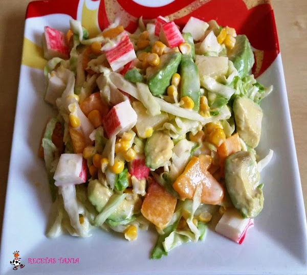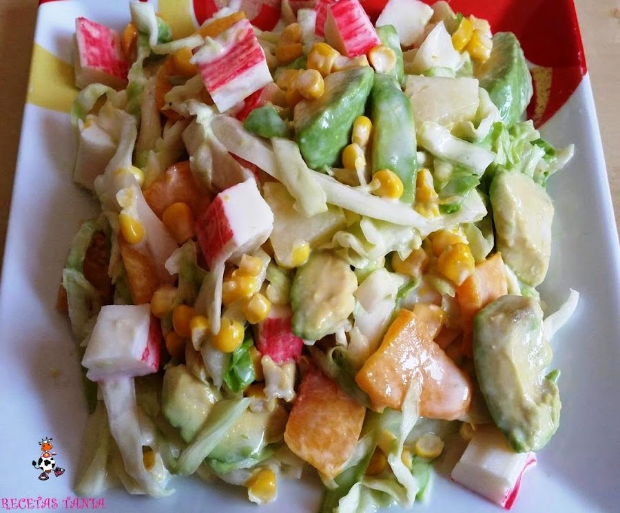 Lavamos, cortamos la col en tiritas finas y la ponemos en un bol. Cortamos en trocitos la piña,el melocotón, los palitos de cangrejo y los añadimos al bol. Añadimos el maíz dulce, el jugo de la piña y un poco del almíbar del melocotón.