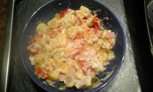 Ahora ponemos a cocer las patatas en una cacerola con agua, dependerá del tamaño de las patatas, si son medianas una media hora. Mientras partimos en trozos los tomates, los pepinillos y el jamón york. Lo añadimos todo a un cuenco, una vez cocida la patata, la pelamos, la partimos en trozos y también la añadimos, le echamos salsa al gusto y ya está lista para comer.