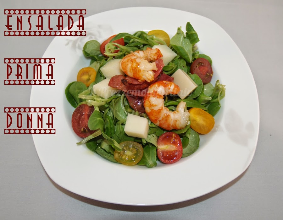 Como bien sabéis los canónigos nos los venden en bolsas en los supermercados ya lavados y escurridos, así que lo único que tenemos que hacer es poner la ración correspondiente en cada plato, a continuación, lavamos los tomates, los partimos por la mitad y los ponemos alrededor de los canónigos, cortamos el queso en tacos y lo disponemos encima de los canónigos. En una sartén ponemos a calentarla un poco sin aceite y salteamos el bacón hasta que este crujiente y lo colocamos en la ensalada. En otra sartén salteamos los langostinos con un diente de ajo, aceite de oliva y sal. Los ponemos en la ensalada y servimos, cada uno puede aliñar la ensalada a su gusto.