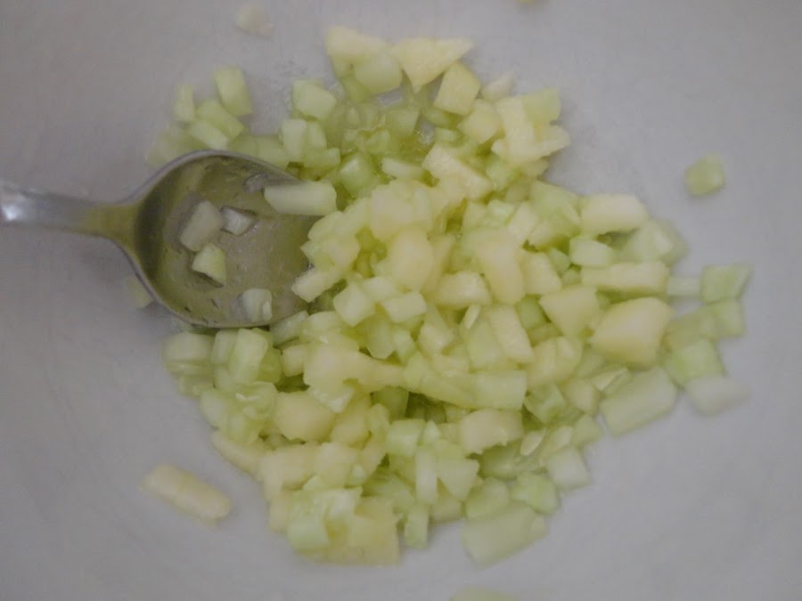 Picamos bien fino el pepino y la manzana, los mezclamos y los aliñamos con sal, aceite y limón.