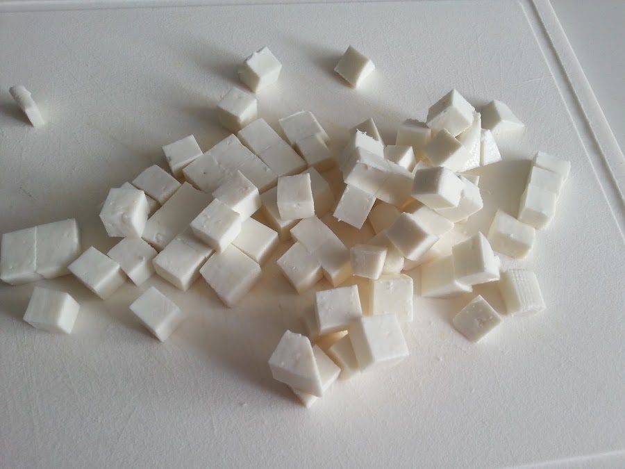 3. - Cortamos medio queso, unos 125 gr, en dados, el tamaño es a gusto del consumidor.