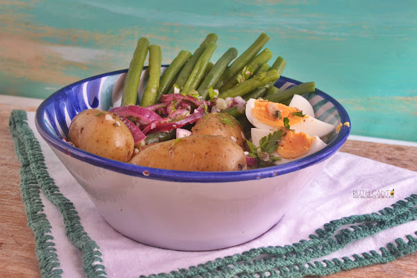 Lavar bien las patatas y poner a cocer unos 20 minutos ( tardan más que las judías así que ponerlas y mientras ir haciendo el resto)