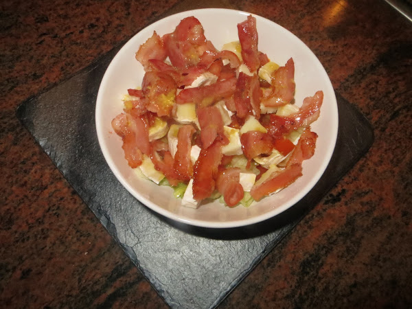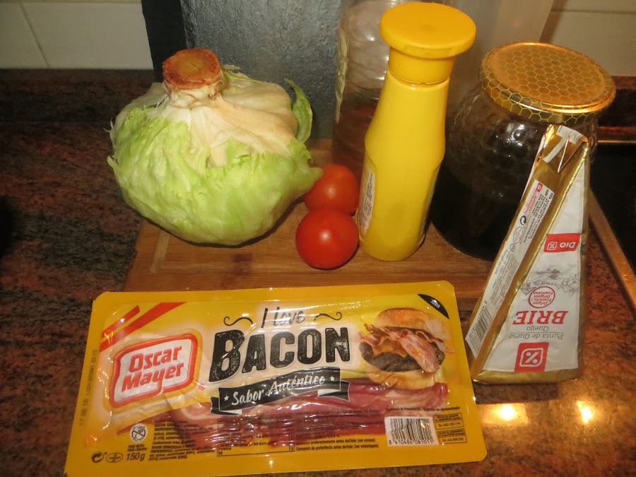 Ponemos el bacon a dorar en una plancha, sin nada de aceite hasta que se dore. Mientras tanto lavamos la lechuga y el tomate y lo picamos en trozos. Cortamos también el queso brie y el bacon cuando esté listo.