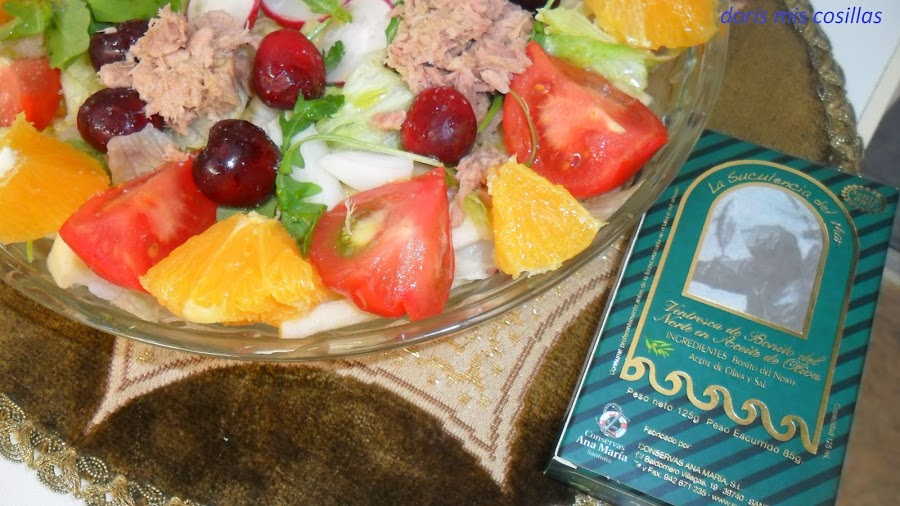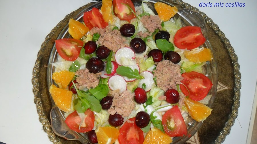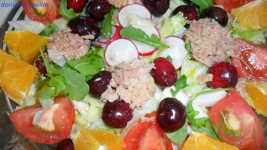 No tiene misterio esta ensalada, lo principal son los ingredientes que sean de buena calidad. Solo limpiar y cotar la lechuga bien escurrida, acomodamos en una fuente de cristal, cortamos la cebolleta en rodajas finas y añadimos. Cortar los tomates en gajos y la naranja en cuartos y añadimos, por último las cerezas, las hojas de rúcula y vertemos por encima junto con la la lata escurrida de bonito.El aceite de la lata lo ponemos en un bol con la sal y vinagre, batimos con un tenedor y rociamos por encima de la ensalada multicolor.